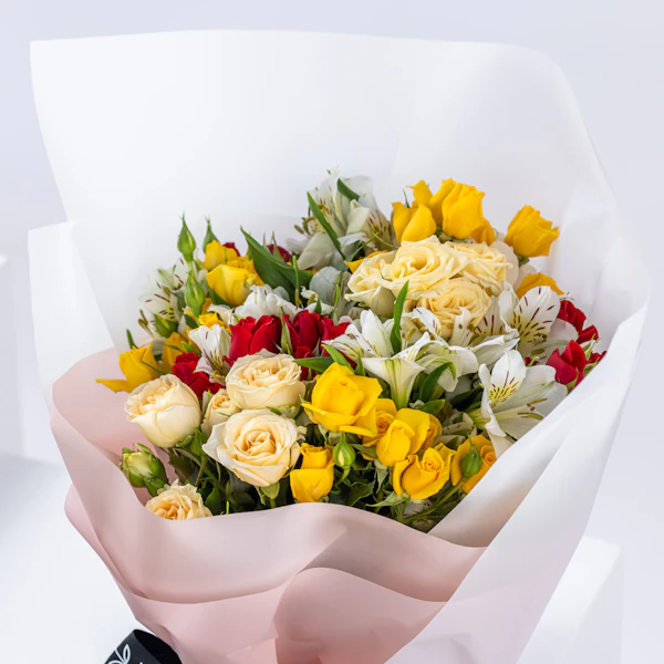 Elevate your birthday celebration with our "Happy Birthday to Me Cake" – a heavenly treat that's as beautiful as it is delicious! Immerse yourself in the luscious layers of chocolate sponge, generously filled with exquisite Belgian chocolate. The joy continues with a stunning arrangement of red, yellow, and peach baby roses, complemented by elegant white alstroemeria. The cake is not just a culinary masterpiece; it's a feast for the eyes. Wrapped in a charming pink and white ensemble, it's the perfect embodiment of happiness. Make your special day unforgettable with the blend of flavors and the floral elegance of this delightful creation!