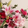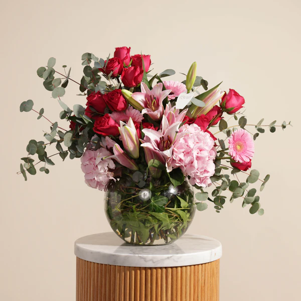 This vibrant floral arrangement features a stunning mix of fuchsia roses, pink gerbera daisies, pink lilies, and pink hydrangeas, all artfully arranged in a chic fishbowl glass vase. The bold hues of fuchsia and pink create a lively and enchanting display, blending rich textures and shapes to create a captivating visual effect. The clear glass vase provides a sleek, modern touch that allows the vivid colors of the flowers to take center stage. Ideal for brightening up any space or celebrating a special occasion, this arrangement exudes elegance and charm, making it a memorable gift for any recipient.
