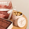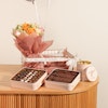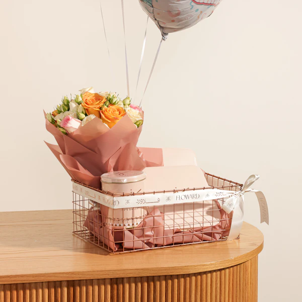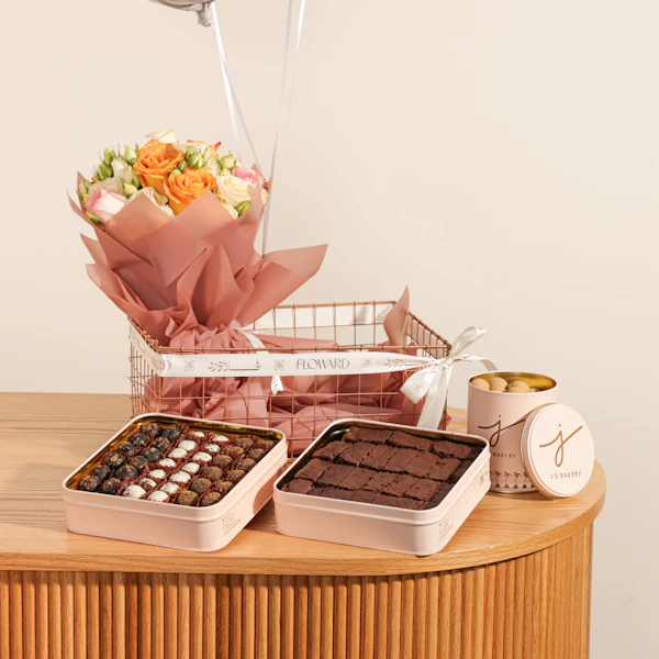 The Classic Gift Basket from J's Bakery is a perfect gift package. It comes in a metallic gift basket filled with an assortment of J's best-selling treats. Inside, you'll find 1 box of reduced-fat brownies, 1 tin of salted caramel balls, and 1 box of assorted chocolate balls, including Oreo balls, brownie balls, and brownie biscuit balls. To add a special touch, it also includes a hand bouquet with beautiful pink roses.