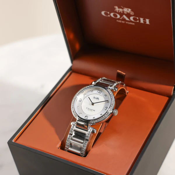 Gift the timeless elegance of the Coach Cary Women's Watch. This sophisticated timepiece has a stunning silver stainless steel band adorned with sparkling diamantes and adds glamour to any outfit. Its classic design, combined with modern luxury, makes it perfect for both everyday wear and special occasions. Packaged in a chic box, this watch is a thoughtful and stylish gift for any woman who appreciates refined craftsmanship and a touch of sparkle.