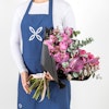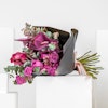 Ascia's Dusk contains purple Roses, Purple Anthurium, Pink Cymbidium and Eucalyptus.