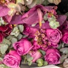 KWD37Ascia's Dusk contains purple Roses, Purple Anthurium, Pink Cymbidium and Eucalyptus.