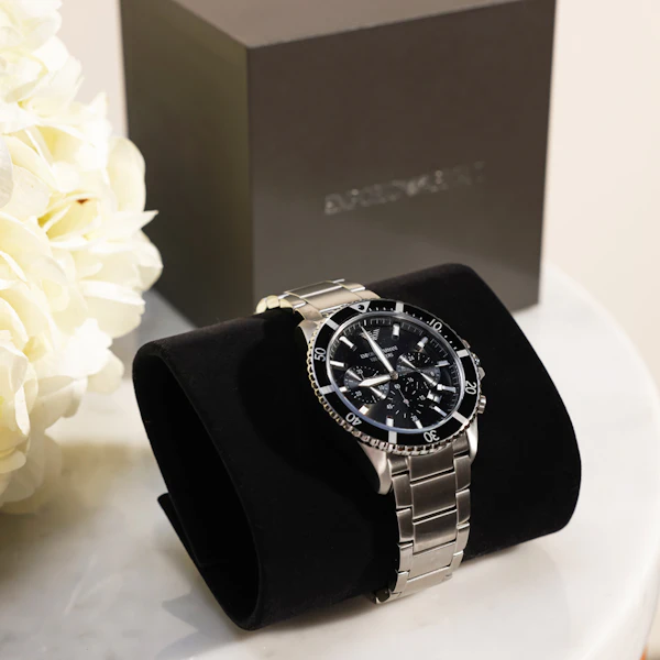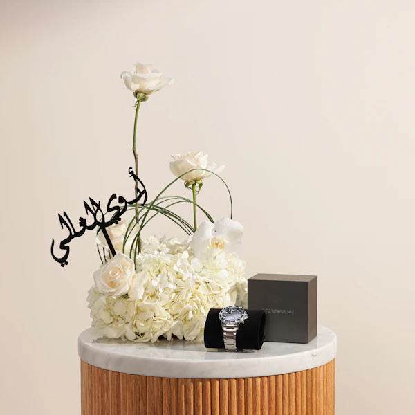 Surprise your beloved father with the timeless elegance of the Emporio Armani Chronograph Stainless Steel Watch. This exquisite timepiece features a sleek design in silver and black, exuding sophistication and style. With its precise chronograph functionality and durable stainless steel construction, it's not just a watch; it's a statement of refined taste and impeccable craftsmanship. Presented on a beautiful arrangement of white flowers adorned with a beloved Father topper, this gift is perfect for Father's Day, his birthday, celebrating his promotion at work, or simply expressing appreciation for his presence in your life, and will surely bring joy and happiness to your dear father's heart.