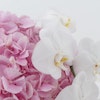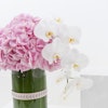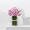 The combination of pink hydrangeas and white orchids in a cylinder vase creates a stunning and sophisticated floral arrangement. The soft and delicate pink color of the hydrangeas adds a romantic touch to the bouquet, while the elegant and pure white of the orchids creates a sense of sophistication. The clear and simple lines of the cylinder vase provide a modern and stylish backdrop for the flowers, allowing their beauty to take center stage. This type of floral arrangement would be perfect for a variety of occasions, such as weddings, anniversaries, or even as a gesture of love and appreciation. The cylinder vase provides a chic and contemporary display for the flowers, making it a great choice for those who prefer a modern and minimalistic style.