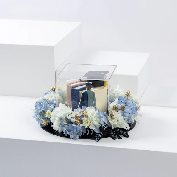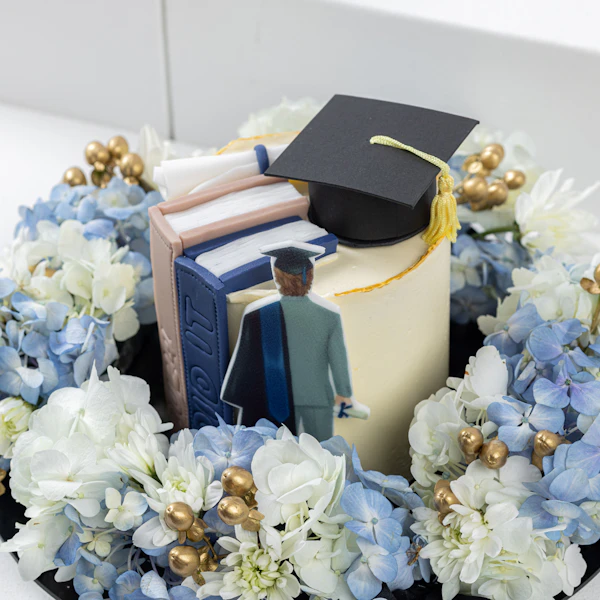 SKU FC61426Celebrate his graduation with Millesaveurs' indulgent Chocolate Flavor Graduation Cake. Perfect for 4-6 people, it's a delightful treat adorned with exquisite floral decorations. White Hydrangeas, Blue Hydrangeas, White Chrysanthemums, and White Hypericum elevate its presentation, adding elegance and charm to the occasion. Crafted with care and precision, this cake not only satisfies the taste buds but also serves as a beautiful centerpiece for the celebration. Whether as a gift or a centerpiece for the party, this cake encapsulates the joyous spirit of achievement, making it a memorable and heartfelt gesture for the graduate.