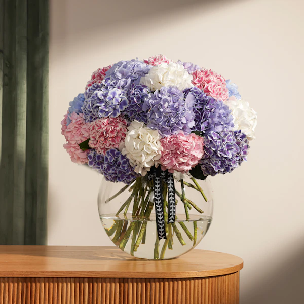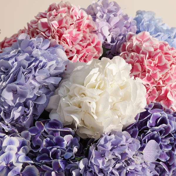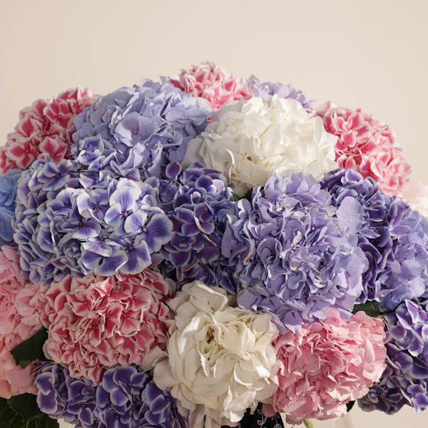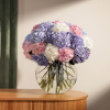 Immerse yourself in the beauty of our exquisite hydrangea arrangement. Featuring a captivating mix of Blue Hydrangea, Pink Hydrangea, Light Blue Hydrangea, White Hydrangea, Purple Hydrangea, and Hydrangea Mag Linn, this stunning display is arranged in a stylish vase. Perfect for any occasion, this arrangement brings a touch of elegance and natural charm to your space. The harmonious blend of colors and textures creates a breathtaking visual experience, making it an ideal gift or a beautiful addition to your decor. Celebrate the splendor of nature with this luxurious hydrangea arrangement, designed to impress and delight.