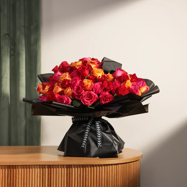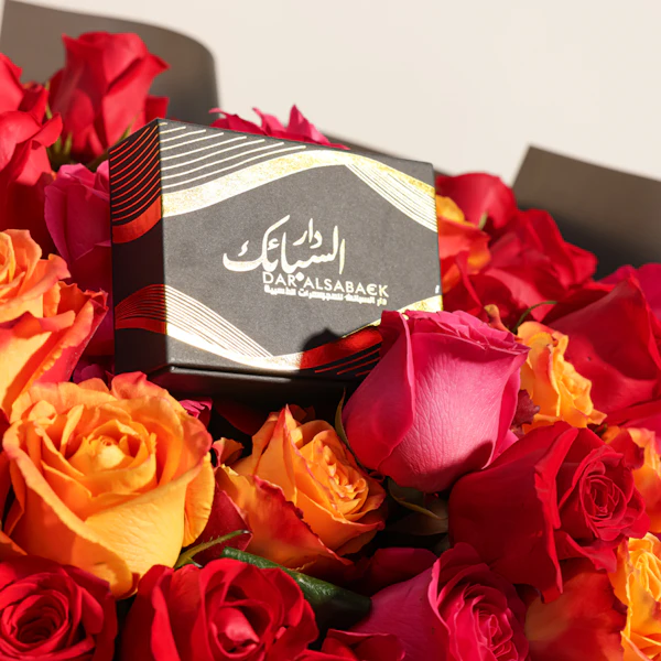 Elevate your romantic gestures with the exquisite Dar Al Sabaek Heart Earrings. Crafted from 21K gold and weighing 3.79 grams, these earrings are designed to capture hearts with their timeless elegance. Paired with a striking bouquet of Red Roses, Cherry Brandy Roses, and Fuchsia Roses, all wrapped in a sleek black, this set is the perfect embodiment of passion and sophistication. Order now to express your love with a touch of luxury and elegance.