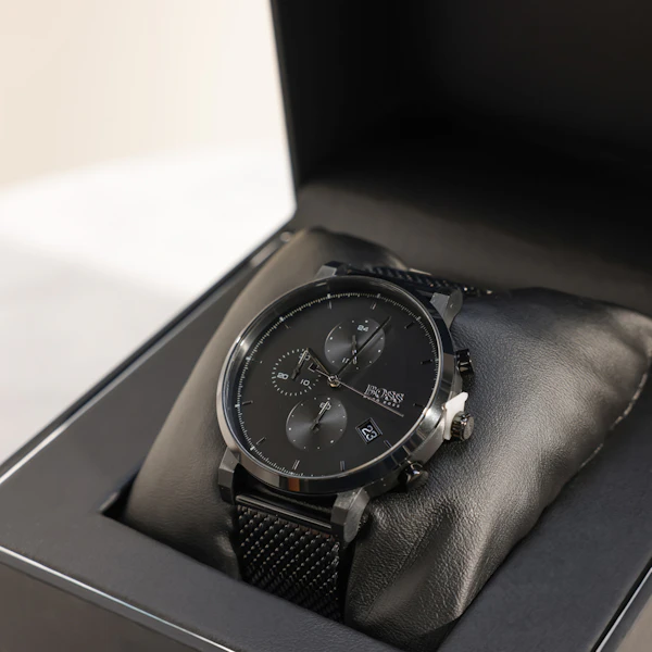 The Hugo Boss Full Black Men’s Watch is a striking blend of sophistication and performance. With a sleek black stainless steel strap and a bold black dial, this chronograph watch exudes modern elegance and edgy style. Its quartz movement ensures precise timekeeping, while the chronograph features add functionality for measuring elapsed time. The all-black design makes a powerful statement, perfect for the man who values both aesthetics and practicality. This watch not only complements a refined wardrobe but also offers reliable performance for everyday use. It’s a remarkable gift that combines luxury with versatility, making a lasting impression.