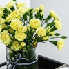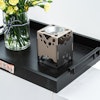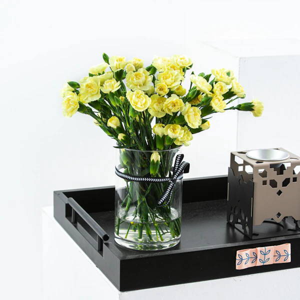 KWD31.314499999999995Stylish metal mubkhar, combines two colors; black and beige. Set on a black tray with a bright-yellow baby carnation arrangement.