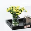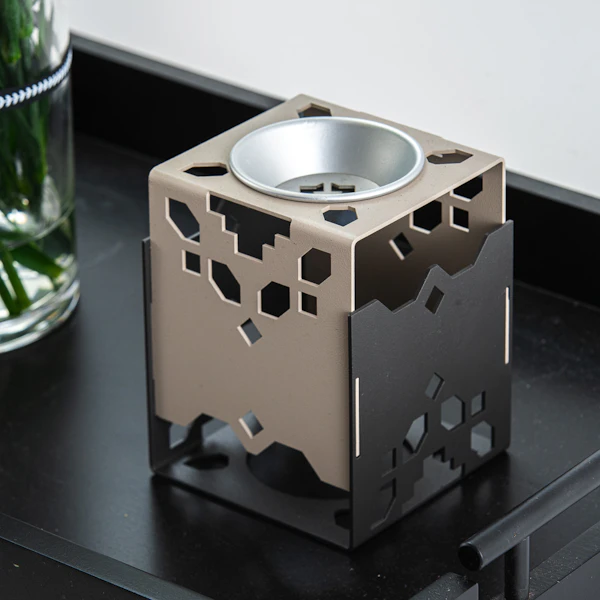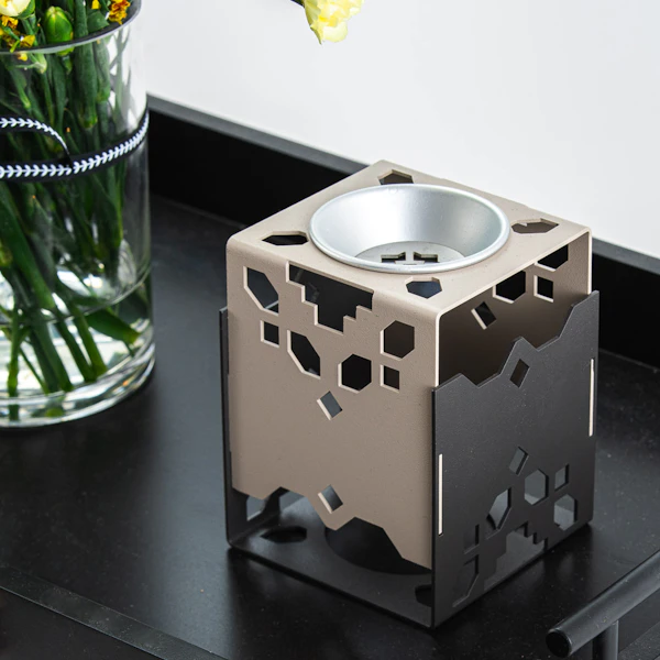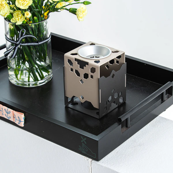 Stylish metal mubkhar, combines two colors; black and beige. Set on a black tray with a bright-yellow baby carnation arrangement.