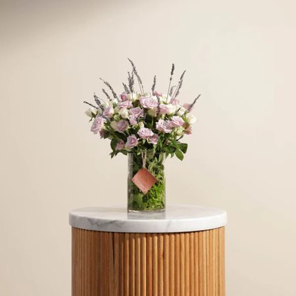 Welcome the new school year with our Royal Ivory Elegance Back to School Arrangement. This exquisite vase features a stunning mix of purple and white baby roses, beautifully adorned with fresh green hdera leaves. The delicate pastel hues of the roses contrast elegantly with the airy green leaves, creating a sophisticated and cohesive look. Set in a clear glass vase, the arrangement provides a refined backdrop that lets the flowers shine. Finished with a charming "Back to School" in Arabic topper, this arrangement makes the perfect gift to celebrate the start of a new academic year. Order now to add a touch of elegance to this special occasion.