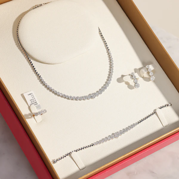 KWD3399Immerse yourself in a world of timeless elegance with the L'azurde Luxury Diamond Set, an opulent ensemble featuring meticulously crafted earrings, necklace, ring, and bracelet, adorned with a dazzling total of 8.5 carats of radiant diamonds. Each piece tells a story of sophistication and refinement, capturing the essence of luxury in its finest form. From the graceful curves of the earrings to the intricate details of the bracelet, every facet sparkles with unparalleled brilliance, making this set a true symbol of enduring beauty and prestige.