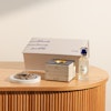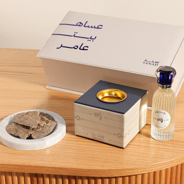 KWD45Box Manzel Mubark from Sanad is a luxurious leather box that includes 18 grams of premium Indian Jar bukhour. The set also comes with a 100 ml spray bottle and an elegant incense burner, both crafted from natural leather, offering a complete and sophisticated fragrance experience.