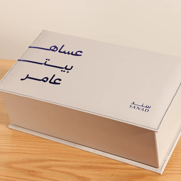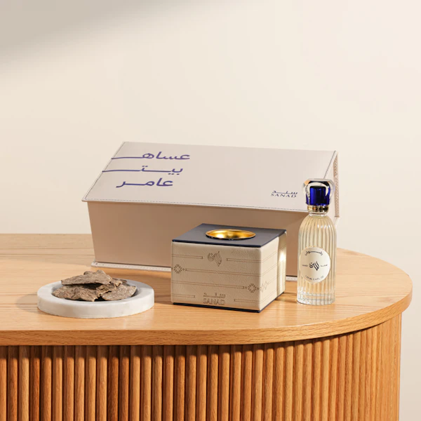 Box Manzel Mubark from Sanad is a luxurious leather box that includes 18 grams of premium Indian Jar bukhour. The set also comes with a 100 ml spray bottle and an elegant incense burner, both crafted from natural leather, offering a complete and sophisticated fragrance experience.