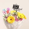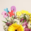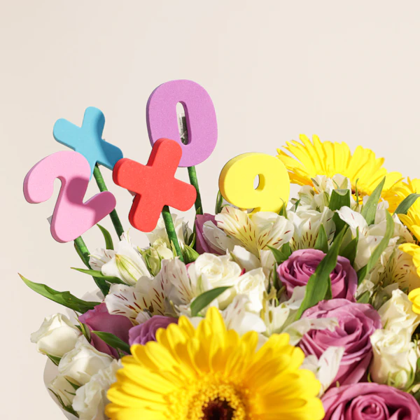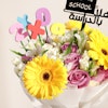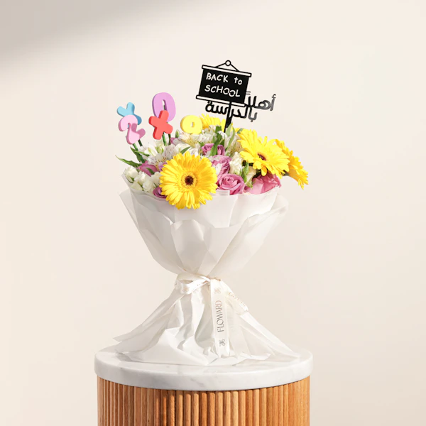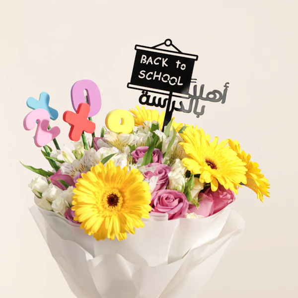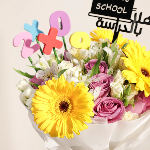 Brighten up the back-to-school season with our enchanting floral arrangement! Featuring elegant White Alstroemeria, pristine White Baby Roses, vibrant Purple Roses, and sunny Yellow Gerbera, this bouquet is a visual delight. Adorned with colorful English alphabet letters and numbers, and beautifully wrapped in white with a special back-to-school topper, it’s the perfect way to celebrate a fresh start. Transform any space with this unique and joyful arrangement—order now and make the new school year unforgettable!