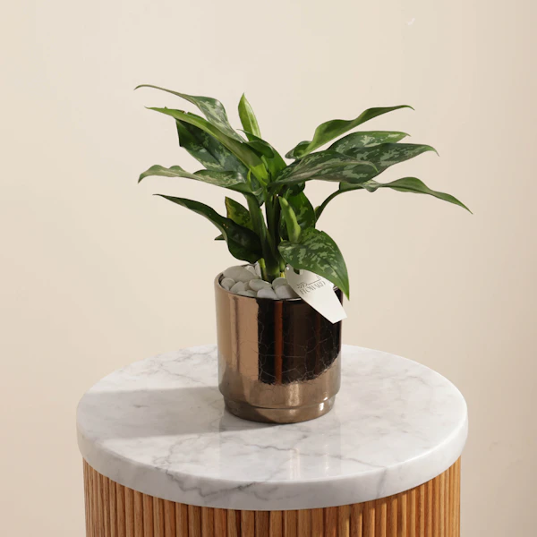 Enhance any space with the Aglaonema Maria Plant, elegantly presented in a chic gold Pot. This lush, vibrant plant adds a touch of greenery and sophistication, promoting a serene atmosphere. The striking gold vase complements the plant's beauty, making it a perfect gift for bringing natural elegance and tranquility to any setting.