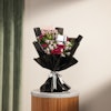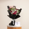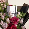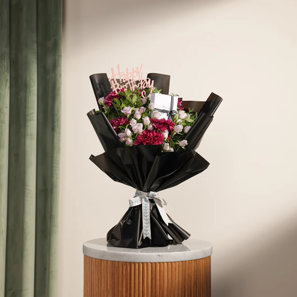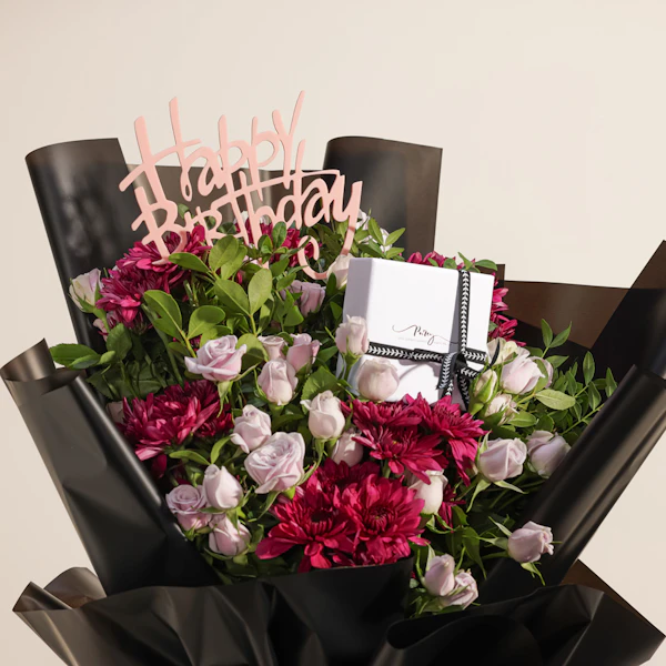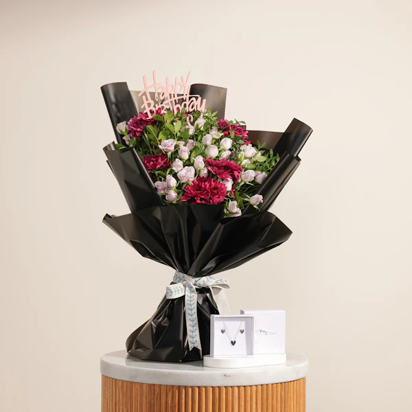 KWD29A special gift for the elegant little princess, a silver heart jewelry set from Purcy, meticulously crafted from 925 silver. This stunning ensemble includes a bracelet, earrings, and a necklace, designed to add a touch of cute elegance to her look. Accompanied by a bouquet featuring charming purple baby roses and purple chrysanthemums in black wrapping, adorned with a delicate pink "Happy Birthday" topper, this gift exudes sophisticated beauty and heartfelt sentiment, making it perfect for celebrating her special day.