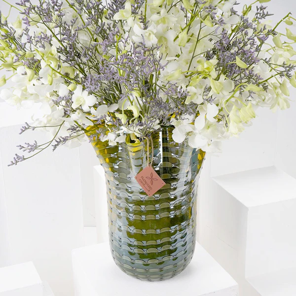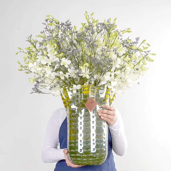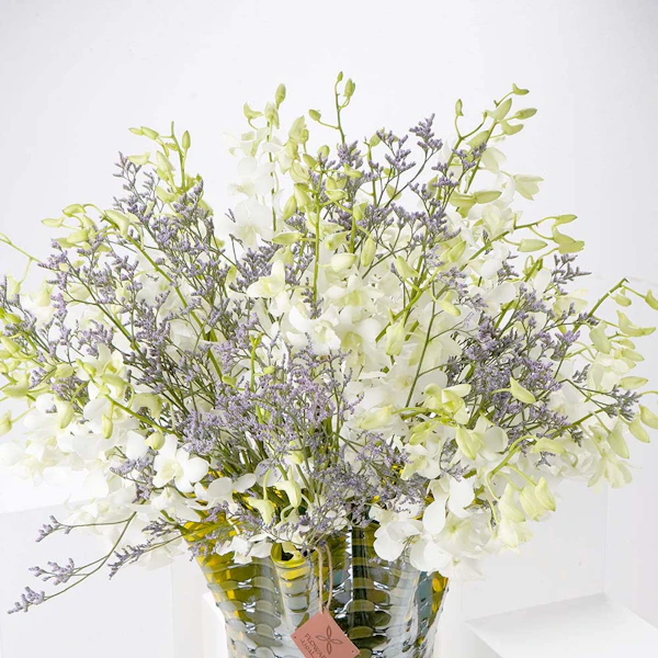 KWD29Gift this stunning arrangement including white baby orchids and sea lavender artistically designed in a yellow vase.