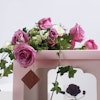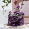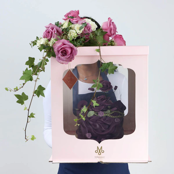 Fancy rosy cake from Millesaveurs decorated with purple roses and white baby roses.
