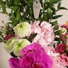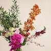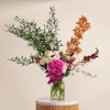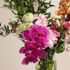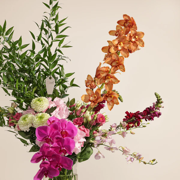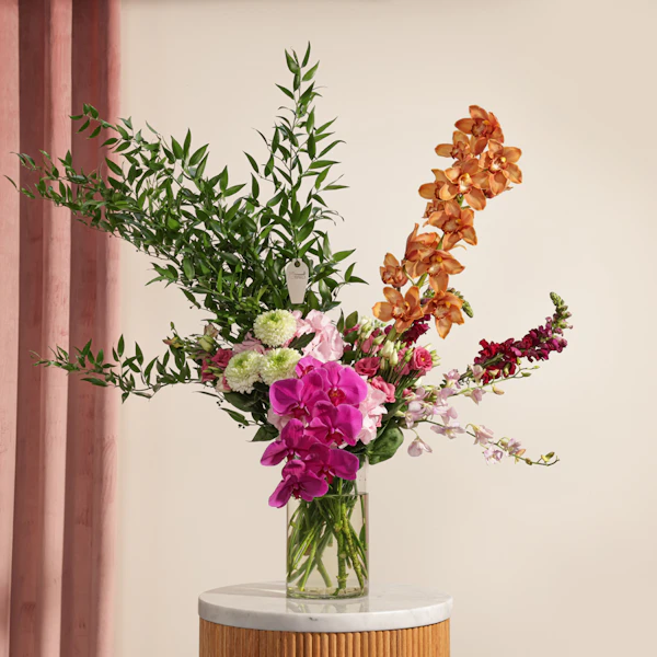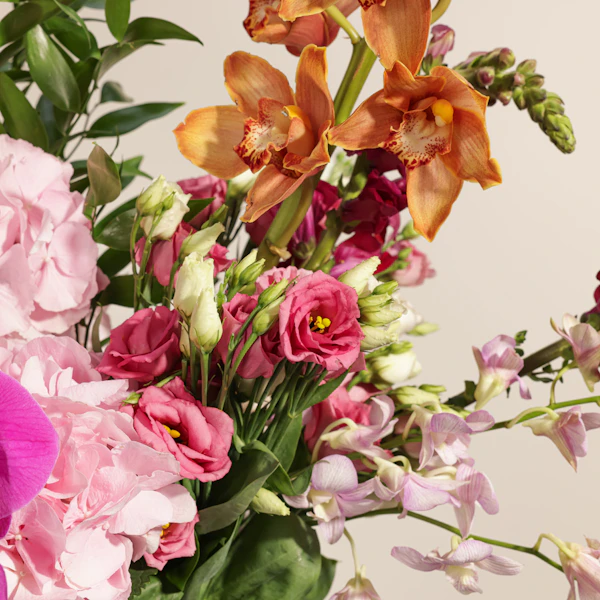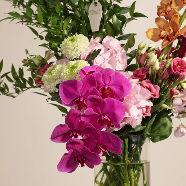 Elevate any occasion with this captivating floral arrangement, showcasing Bing Bong Chrysanthemums, Purple Orchid, and Pink Hydrangea. Light Pink Eustoma adds a delicate touch, while Bordeaux Anthurium and Pink Baby Orchid bring vibrant elegance. Bronze Cymbidium enhances the bouquet with a touch of luxury, all meticulously arranged in a sleek cylinder glass vase. This exquisite gift transforms any space with its stunning beauty, creating a sense of joy and celebration. Its enchanting presence uplifts the spirit, making the recipient feel cherished and special, and leaving a lasting impression of thoughtfulness and love.