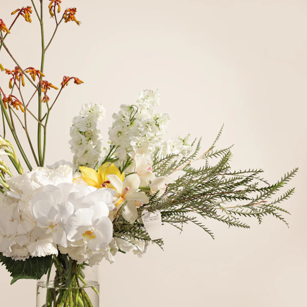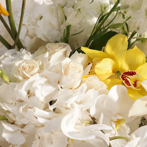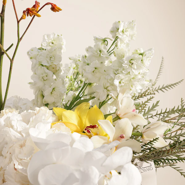 Celebrate elegance with this stunning floral arrangement featuring a blend of exquisite blooms. A combination of White Cymbidium and Yellow Cymbidium orchids, complemented by delicate White Hydrangea and White Roses, all artfully arranged in a sleek cylinder glass vase. Perfect for adding a touch of sophistication to any setting, this gift exudes timeless beauty and grace, making it a memorable choice for any occasion.