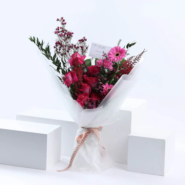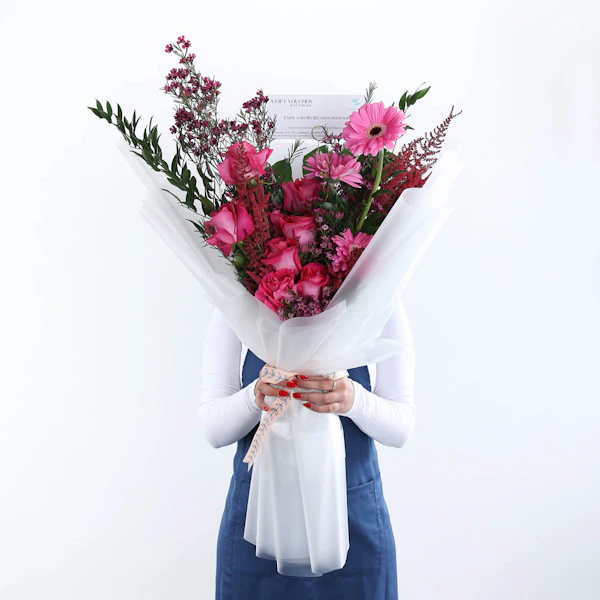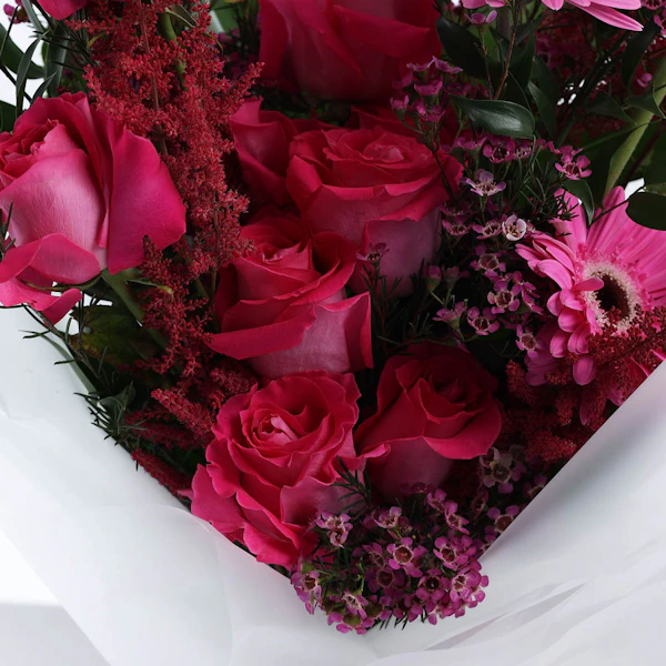 Treat someone special to a rejuvenating experience with the Sparadise Massage Voucher, offering a luxurious 60-minute massage exclusively for women. This relaxing session is perfect for unwinding and de-stressing. To accompany this indulgent gift, the voucher comes with a beautiful floral arrangement featuring vibrant fuchsia astilbe, cheerful pink gerberas, and elegant fuchsia roses, all wrapped in a crisp white wrap. This combination of a soothing massage and striking flowers makes for a thoughtful and elegant gift, perfect for celebrating any occasion or simply showing appreciation.
