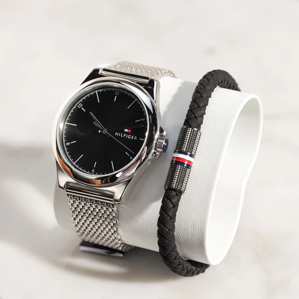 Elevate his style with the Tommy Hilfiger Silver Watch and Leather Bracelet Gift Set, a sophisticated choice for the modern gentleman. This set features a sleek silver-toned watch with a stainless steel strap and a bold black dial, embodying timeless elegance and functionality. Complementing the timepiece is a genuine leather bracelet, adding a touch of contemporary flair to any ensemble. Perfect for everyday wear or special occasions, this gift set combines craftsmanship, versatility, and iconic Tommy Hilfiger design, making it a distinguished gift for the discerning man in your life.