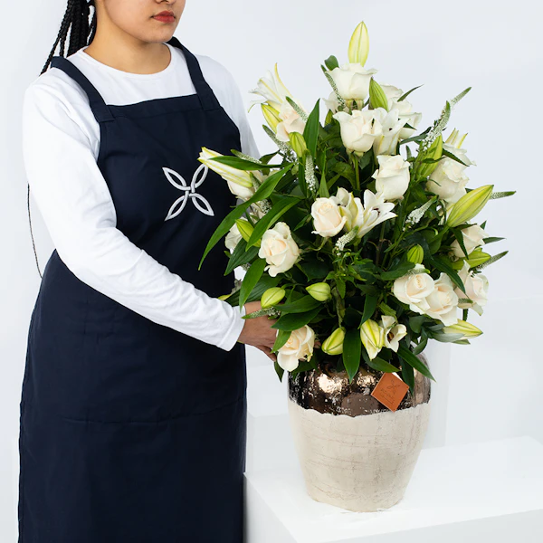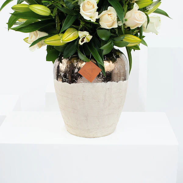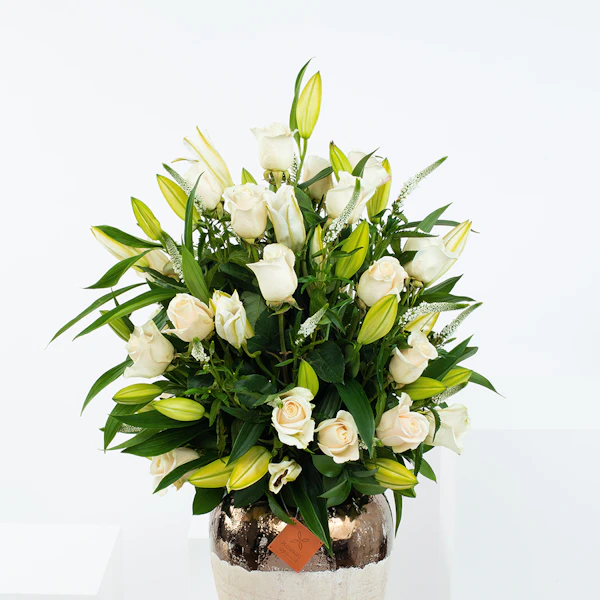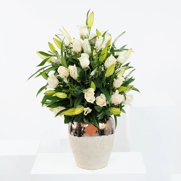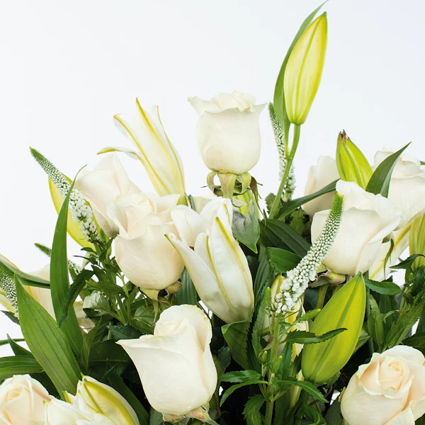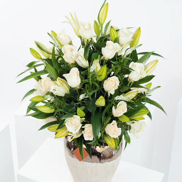 Wonderful in white Vase with baby rose white , lilly white and veronia white