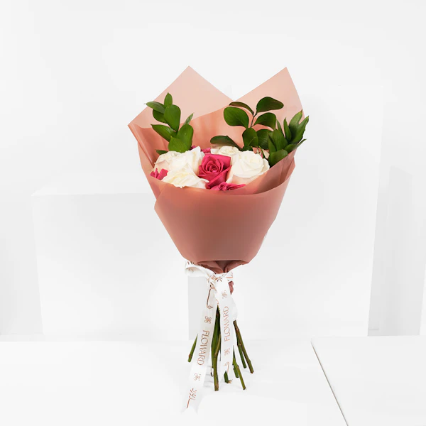Make Mom's day extra special with our Floward Best Mum Small Cake, a delightful blend of vanilla, caramel, and dark chocolate flavors. Perfectly sized to serve 2, it's an intimate treat for you and Mom to share. Accompanying this indulgent cake is a hand bouquet featuring the purity of White Roses, the vibrant charm of Fuchsia Roses, and the lush greenery of Ruscus foliage. All elegantly presented with creme wrapping, adding a touch of sophistication to your gift. Show your love and appreciation for Mom with this exquisite combination of gourmet cake and fresh blooms, sure to make her smile on any occasion.