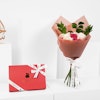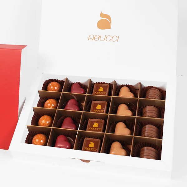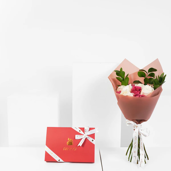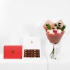 QAR440Indulge in the luxurious flavors of our Abucci Chocolate Box, featuring 16 exquisite pieces. Savor the delightful blend of crunchy veloutine, hazelnut cream, nougat, cookies, praline, and dulce, ensuring a sensational taste experience. Accompanying this indulgent treat is a hand bouquet adorned with the purity of White Roses, the vibrant charm of Fuchsia Roses, and the lush greenery of Ruscus foliage, elegantly wrapped in creme wrapping.