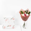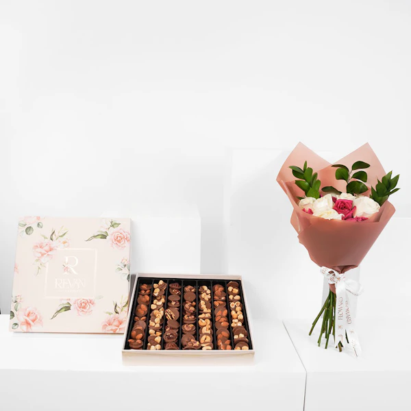 Surprise Mom with our delightful Revan chocolate discs with nuts box, a decadent assortment weighing 700g. Each bite is a perfect blend of rich chocolate and crunchy nuts, creating a heavenly taste experience. Accompanying this indulgent treat is a hand bouquet featuring the purity of white roses, the vibrant charm of fuchsia roses, and the lush greenery of ruscus foliage, elegantly wrapped in creme wrapping.