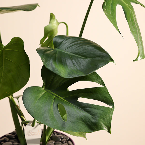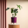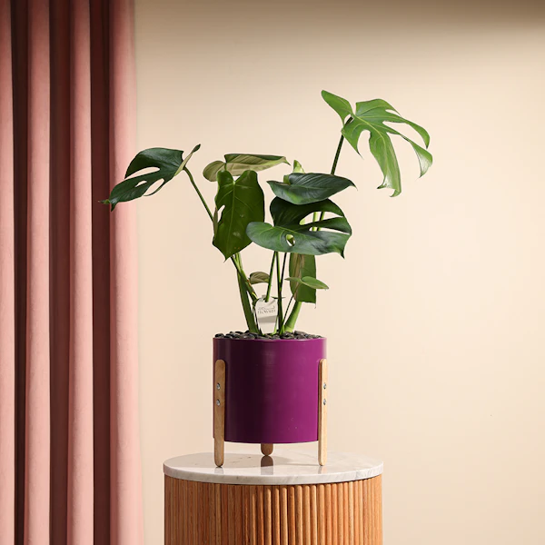 Discover the beauty of the Monstera Deliciosa plant, also known as the Swiss Cheese Plant, elegantly presented in a purple metal vase. This plant is an excellent choice for home and office decoration. It thrives in low to medium light and requires watering once a week. Ideal growing temperatures range from 15°C to 25°C, with a medium care level. The Monstera plant also purifies the air, making it a healthy addition to your space. It's recommended to change the soil once every three years and to feed the plant monthly. Add a touch of natural beauty and health to your environment with this perfect gift.