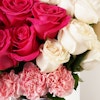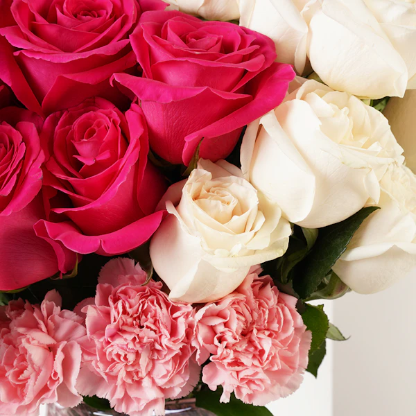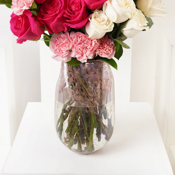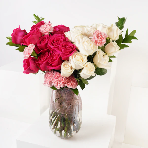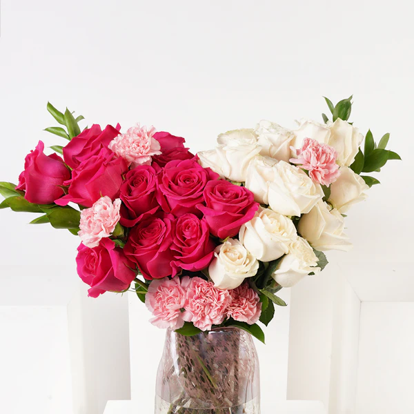 Elevate gift with our exclusive arrangement, it is a radiant collection embodying love and beauty. Immerse your loved ones in a world of vibrant emotions with the passionate hues of Red Roses, the deep allure of Fuchsia Roses, and the delicate charm of Pink Carnations. Expertly arranged in a stylish glass vase. Express your gratitude and love with this harmonious blend of blooms. Make an unforgettable memory with this collection, a testament to the enduring bond that transcends words.