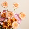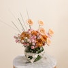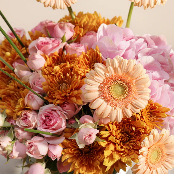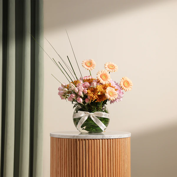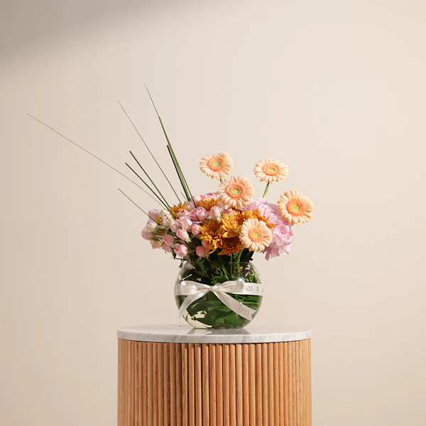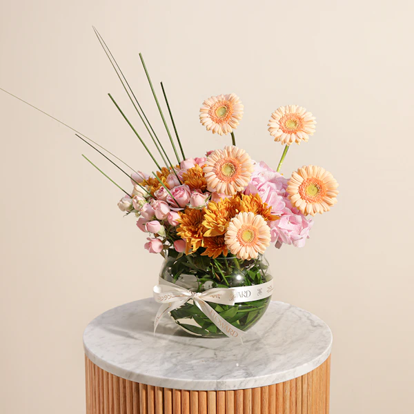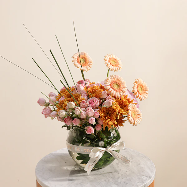 This exquisite floral arrangement is a harmonious blend of vibrant and soft hues, thoughtfully designed to brighten any room. At its heart, the arrangement features striking orange chrysanthemums, renowned for their bold color and intricate petals. Complementing these are delicate pink hydrangeas, known for their lush, full blooms and soft, romantic tone. Salmon gerberas add a touch of warmth with their cheerful, daisy-like faces, while the sweet, subtle pink baby roses offer a classic and elegant finish. All these beautiful flowers are elegantly arranged in a sleek fishbowl glass vase, allowing the colorful blooms to stand out while providing a contemporary touch to any decor. Perfect for special occasions or simply as a delightful treat for yourself, this arrangement exudes charm and grace, bringing a fresh, vibrant energy to any space.