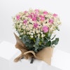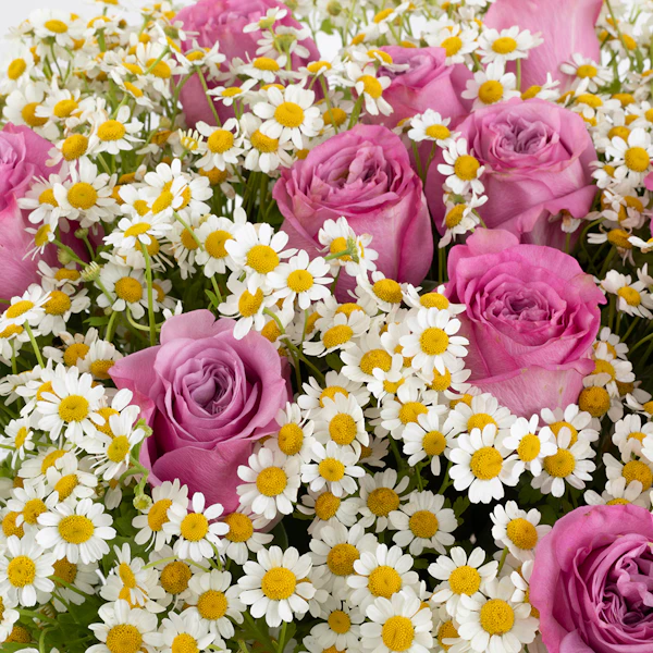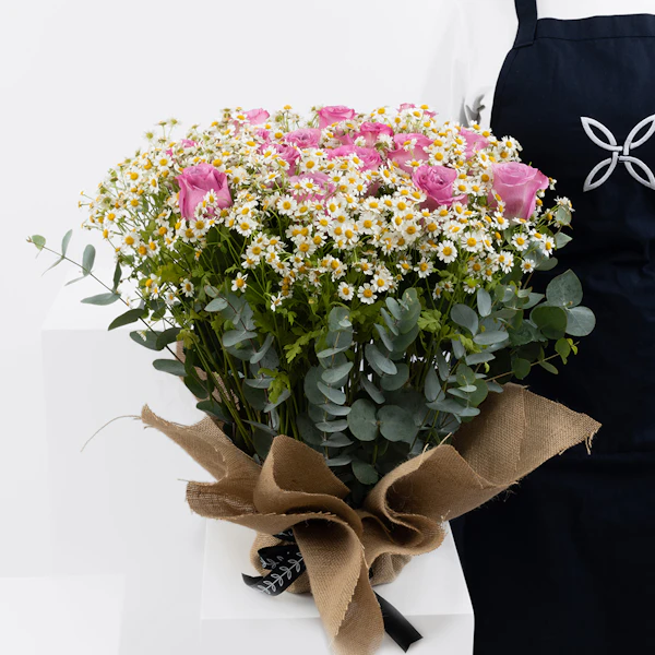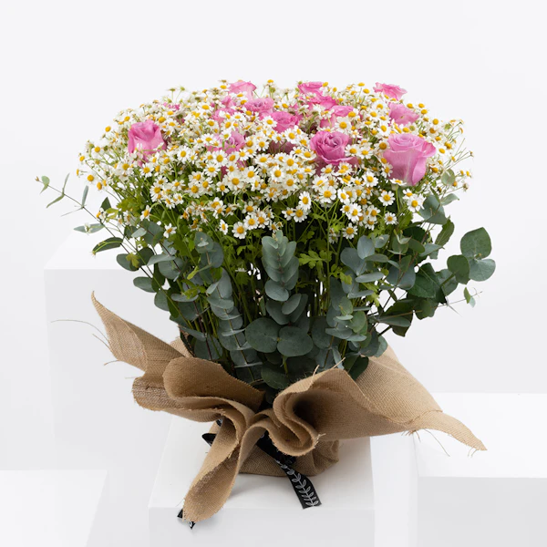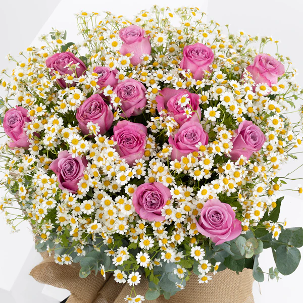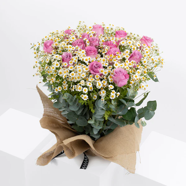 A bouquet of chamomile and purple roses in a Khesh wrapping would make for a beautiful and elegant gift. The delicate white flowers of chamomile are known for their calming properties and are often used in teas to help soothe the mind and body. The deep purple color of the roses represents love, respect, and admiration, making them a timeless and classic choice for a bouquet. The Khesh wrapping, a traditional Bengali handloom fabric, adds an extra touch of uniqueness and cultural significance to the gift. This bouquet is sure to be appreciated and treasured by the recipient.