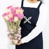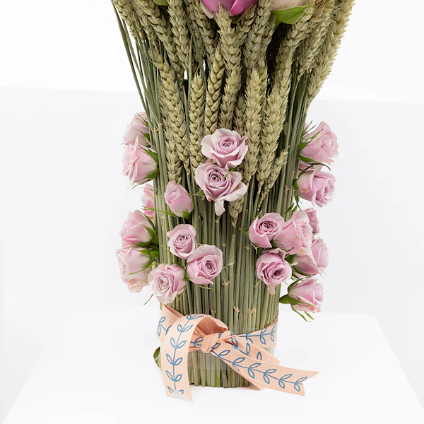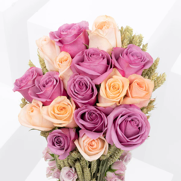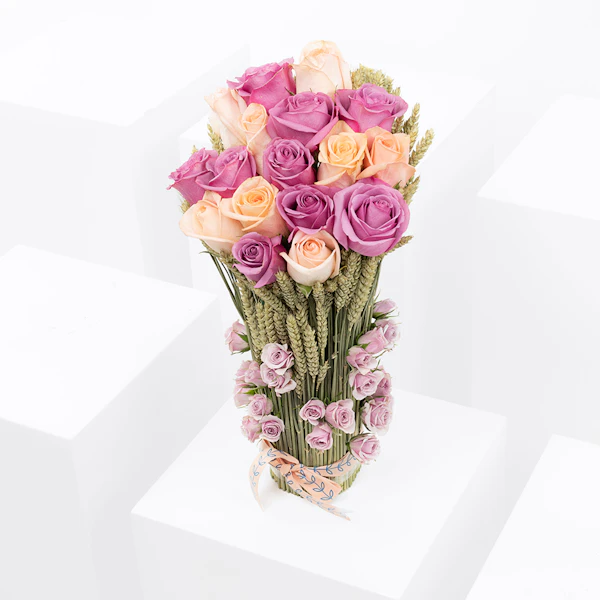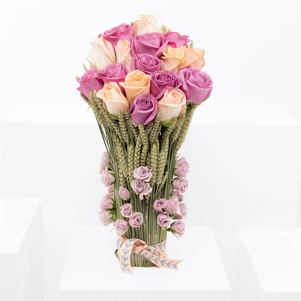 QAR340Peach roses symbolize gratitude, Purple roses symbolize admiration, Purple baby roses symbolize innocence, and Dried wheat symbolizes prosperity. All make great additions to a hand bouquet.