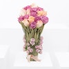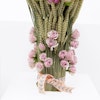 Peach roses symbolize gratitude, Purple roses symbolize admiration, Purple baby roses symbolize innocence, and Dried wheat symbolizes prosperity. All make great additions to a hand bouquet.