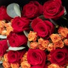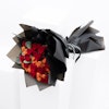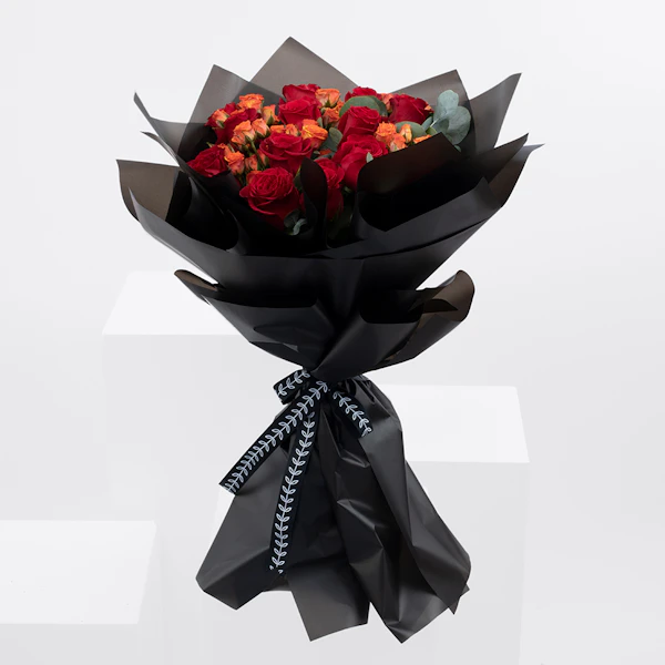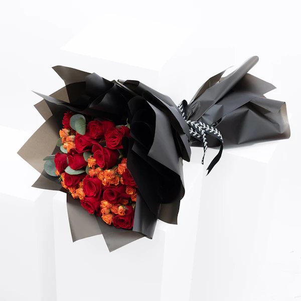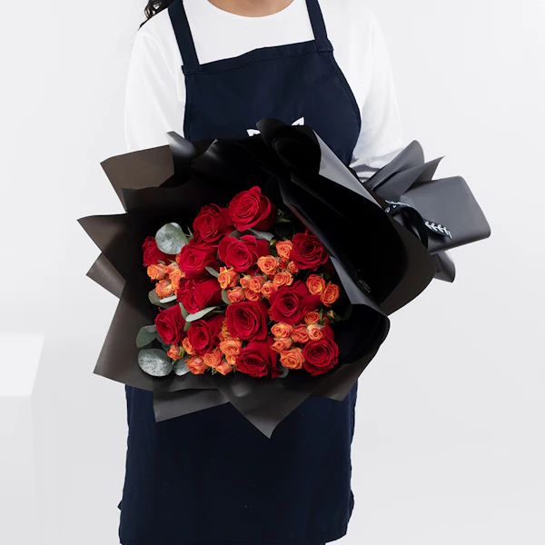 QAR240Hand bouquet with Eucalyptus, Baby Rose-Orange, and Red roses.