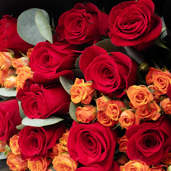 Hand bouquet with Eucalyptus, Baby Rose-Orange, and Red roses.