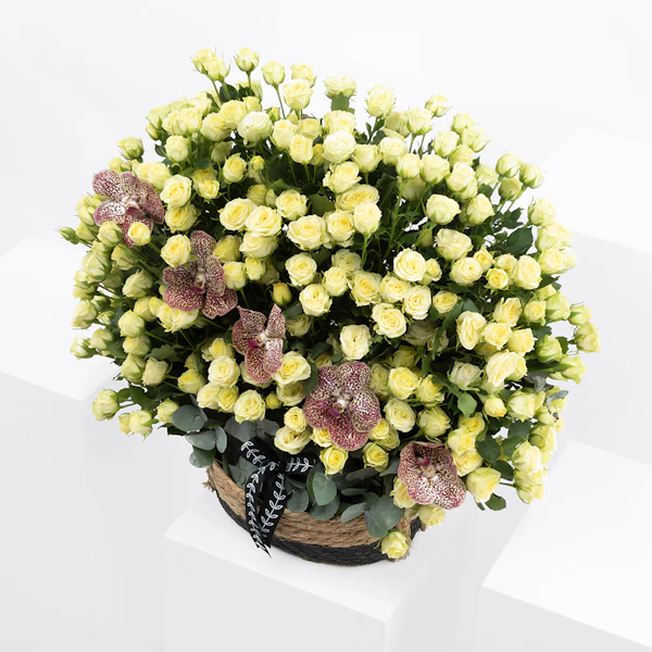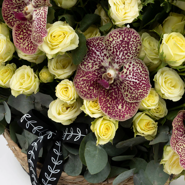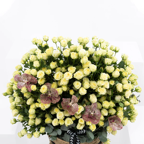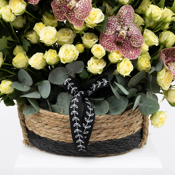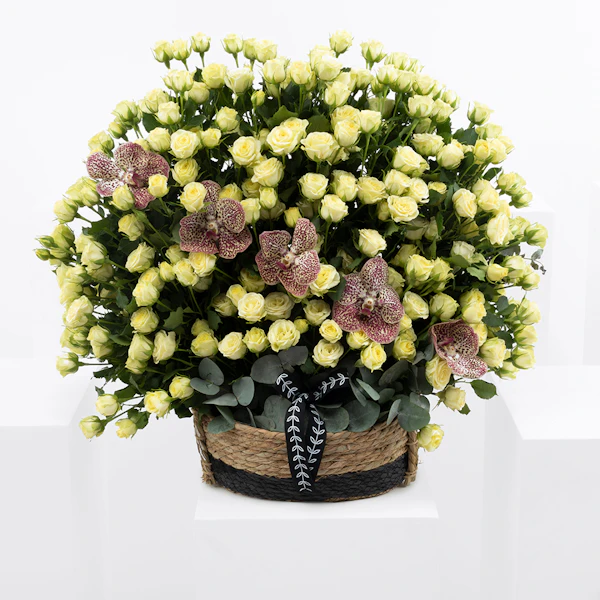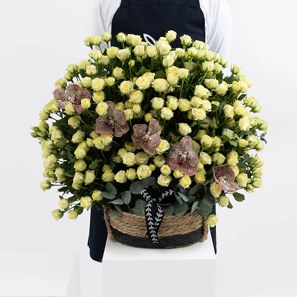 QAR450Delight your loved ones with our exquisite floral gift set, perfect for any occasion. This charming arrangement features a delicate Baby Rose in pure white, the vibrant Orchid Tiger, and the soothing hues of Eucalyptus, all beautifully nestled in a rustic brown basket. Each element is carefully selected to create a harmonious blend of elegance and natural beauty. Ideal for expressing your love and appreciation, this gift set adds a touch of sophistication and serenity to any space. Elevate your gifting experience with a touch of floral luxury today.