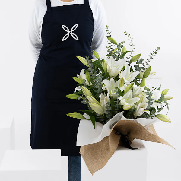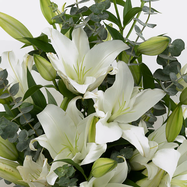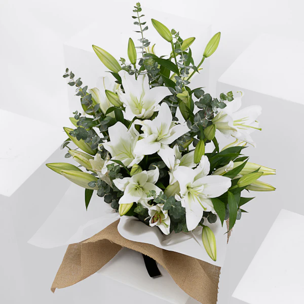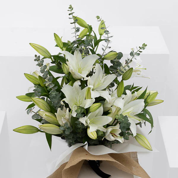 The hand bouquet consists of 10 white lilies and 2 eucalyptus stems wrapped in khesh and white wrapping paper. The white lilies are a symbol of purity and innocence, while eucalyptus represents protection and healing. Together, they make a beautiful and meaningful bouquet perfect for a variety of occasions, such as weddings, birthdays, or even as a gift to show someone you care. The khesh and white wrapping paper add a touch of elegance and sophistication to the overall presentation of the bouquet.