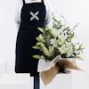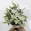 QAR280The hand bouquet consists of 10 white lilies and 2 eucalyptus stems wrapped in khesh and white wrapping paper. The white lilies are a symbol of purity and innocence, while eucalyptus represents protection and healing. Together, they make a beautiful and meaningful bouquet perfect for a variety of occasions, such as weddings, birthdays, or even as a gift to show someone you care. The khesh and white wrapping paper add a touch of elegance and sophistication to the overall presentation of the bouquet.