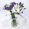 QAR280White lilies and blue statice in a cylinder glass vase make for a beautiful floral arrangement. The combination of the white lilies and blue statice creates a lovely contrast, with the purity of the white lilies being complemented by the calming blue of the statice. The clean lines of the cylinder glass vase also add a touch of elegance to the overall look. This arrangement would be perfect for a variety of occasions, including weddings, birthdays, or simply as decoration for your home.