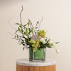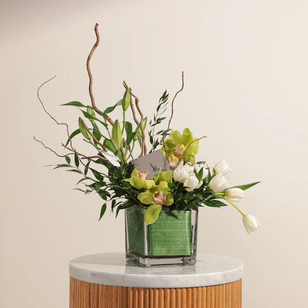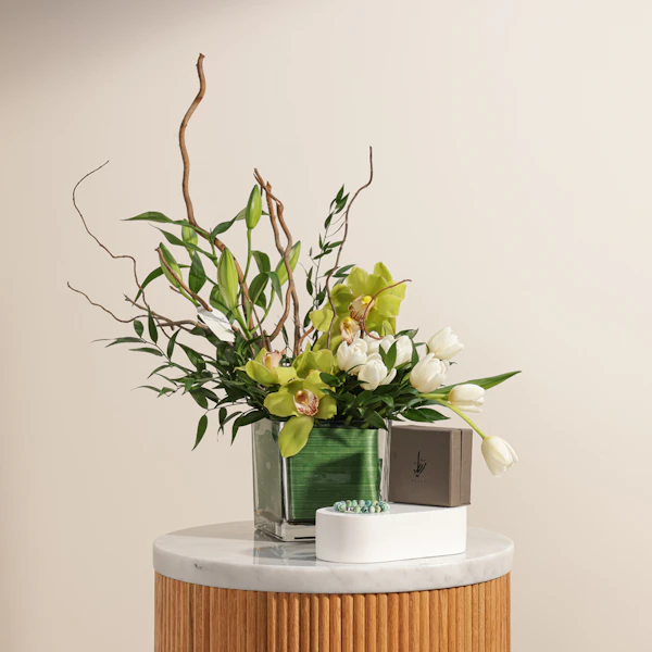 SKU FC70201The Variscite Bracelet with Silver from Zayan is a beautiful piece of jewelry that highlights the soothing, pale green hues of variscite stone paired with the timeless elegance of silver. This bracelet brings a touch of tranquility and refinement to any outfit. Accompanying this exquisite piece is a glass vase containing pristine white tulips, symbolizing purity and elegance.