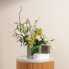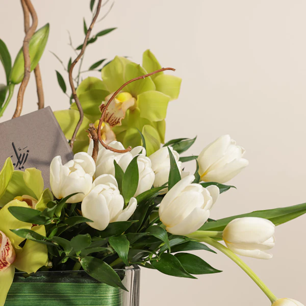 QAR720The Variscite Bracelet with Silver from Zayan is a beautiful piece of jewelry that highlights the soothing, pale green hues of variscite stone paired with the timeless elegance of silver. This bracelet brings a touch of tranquility and refinement to any outfit. Accompanying this exquisite piece is a glass vase containing pristine white tulips, symbolizing purity and elegance.