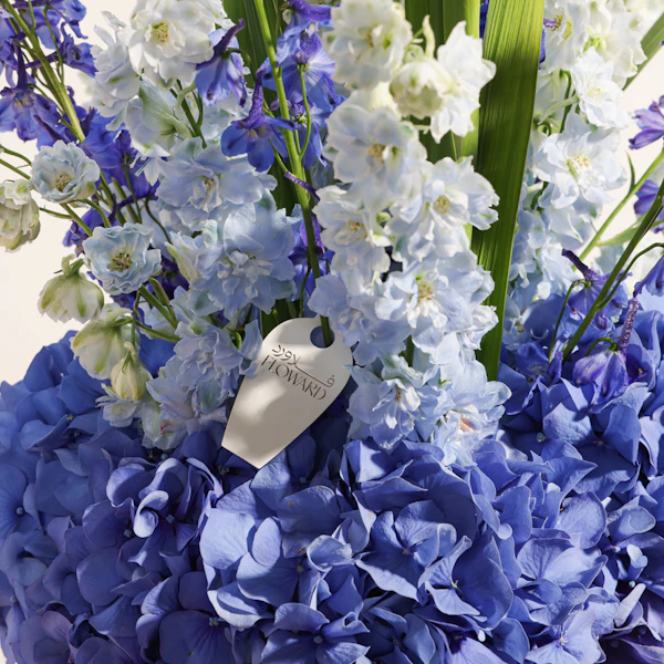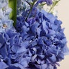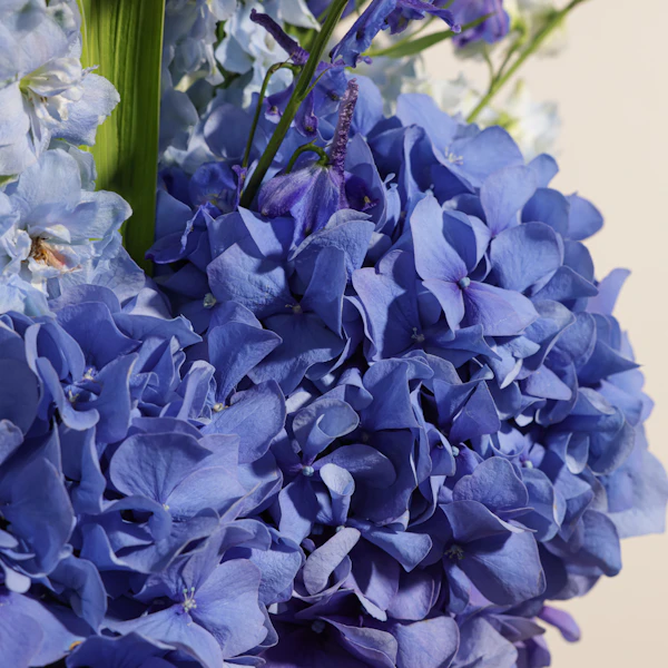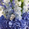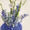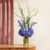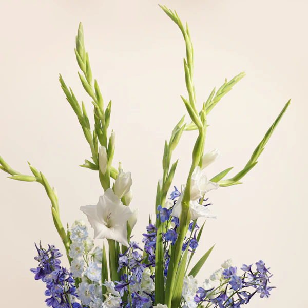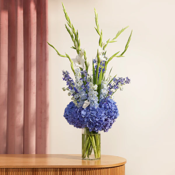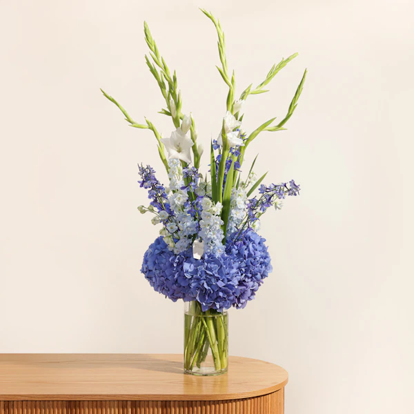 This striking arrangement showcases the elegance of white gladiolus alongside vibrant blue hydrangeas and both dark and light blue delphiniums, all artfully arranged in a sleek cylinder glass vase. The gladiolus, with its tall, sword-like blooms, symbolizes strength, integrity, and sincerity, adding a poignant depth to the bouquet's aesthetic. Paired with the soothing hues of the hydrangeas and the dynamic blues of the delphiniums, this arrangement creates a harmonious blend of colors and textures that evoke a sense of serenity and admiration. It's a gift that not only captivates with its visual appeal but also conveys heartfelt sentiments of admiration and appreciation.