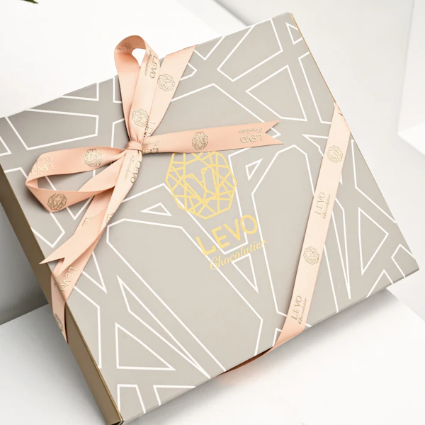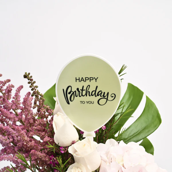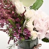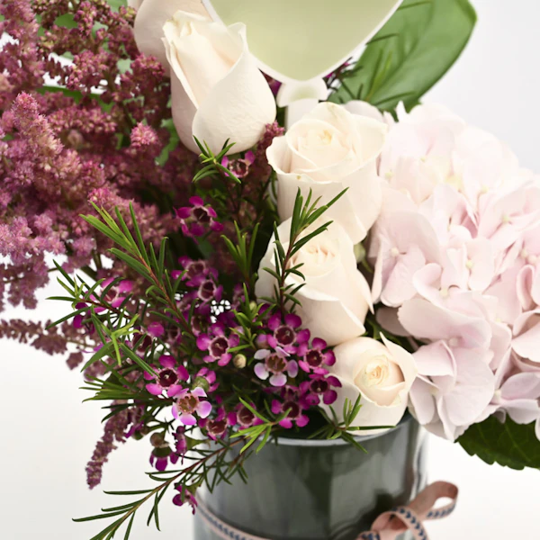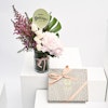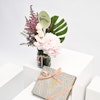 Vase arrangement contains with pink hydrangea with white rose purple Waxflower and Levo large box chocolate