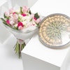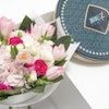SAR575Experience the joy and celebration with Zamani's "Kol w Shokr" Baklava, weighing 400 grams, the perfect gift to present to your family members. This Baklava stands out with its wonderful and distinctive flavor, composed of layers of thin pastry filled with a rich mixture of nuts and natural honey. To add a touch of beauty and happiness, we offer you a delightful flower bouquet featuring fuchsia roses, pink tulips, pink hydrangeas, white baby roses, and green aralias, wrapped in a white cover. This refined gift expresses feelings of love and gratitude to your family members, adding a touch of joy and happiness to any family occasion.