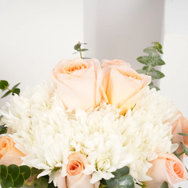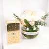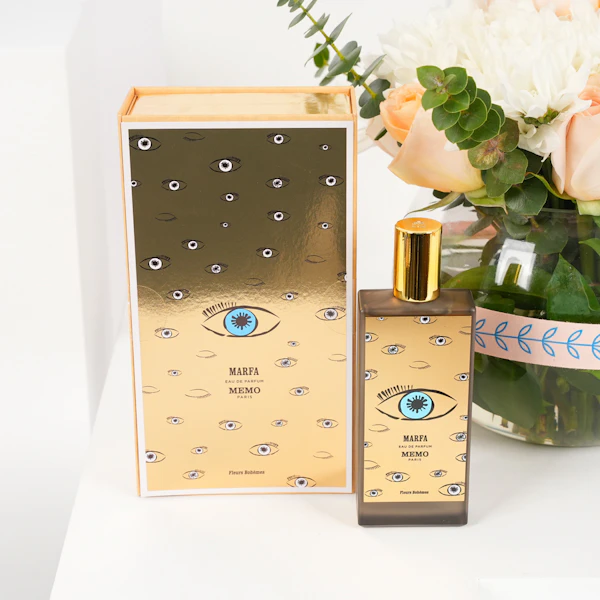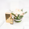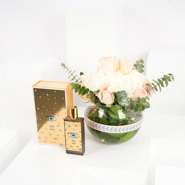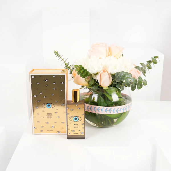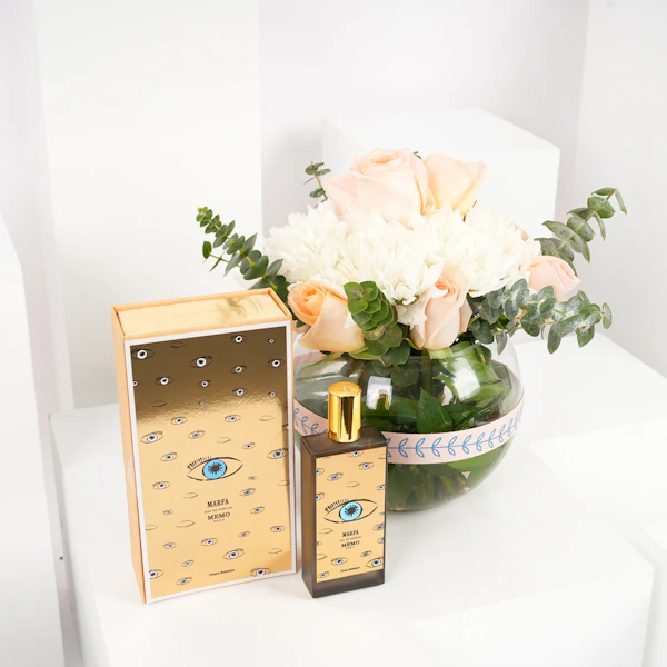 The gift of Marfa Memo Paris Eau De Parfum Unisex, accompanied by a vase of Peach Roses and White Chrysanthemums, is a harmonious blend of fragrance and floral elegance. Marfa, with its unisex appeal, offers a unique olfactory experience with notes that captivate and intrigue. Paired with this exquisite fragrance is a beautiful vase arrangement featuring the soft and warm tones of Peach Roses and the pristine beauty of White Chrysanthemums. The combination of these blooms creates a visually stunning and emotionally resonant bouquet. The sweet and delicate aroma of the roses complements the allure of Marfa, making this gift a thoughtful and sophisticated choice for expressing love, and appreciation, or celebrating a special occasion. It's a sensory journey that combines the allure of a captivating scent with the timeless beauty of fresh flowers.