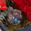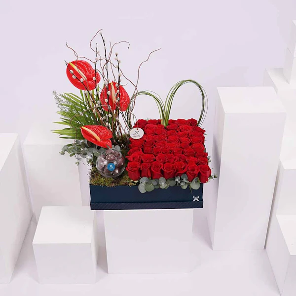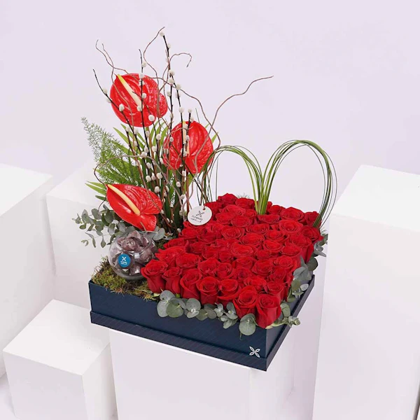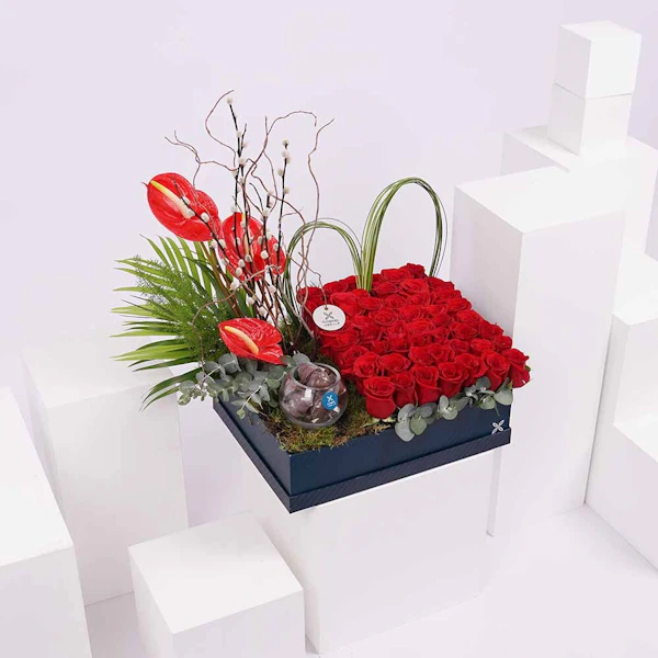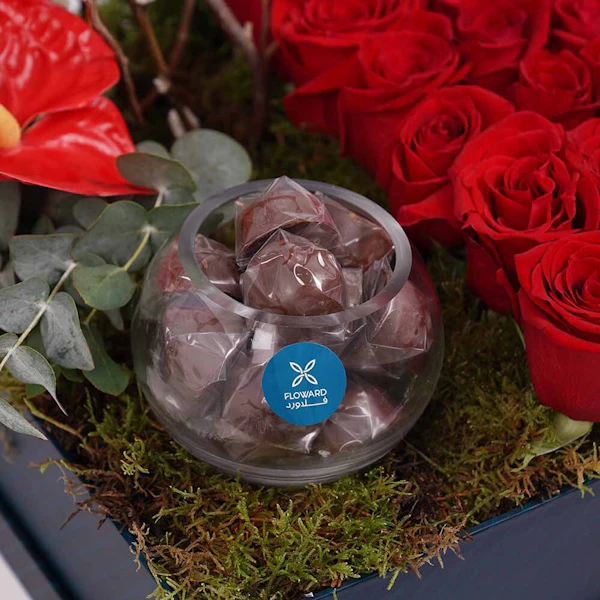 Bouquet conatins the red Anthurium and red roses with a vase of chocolate